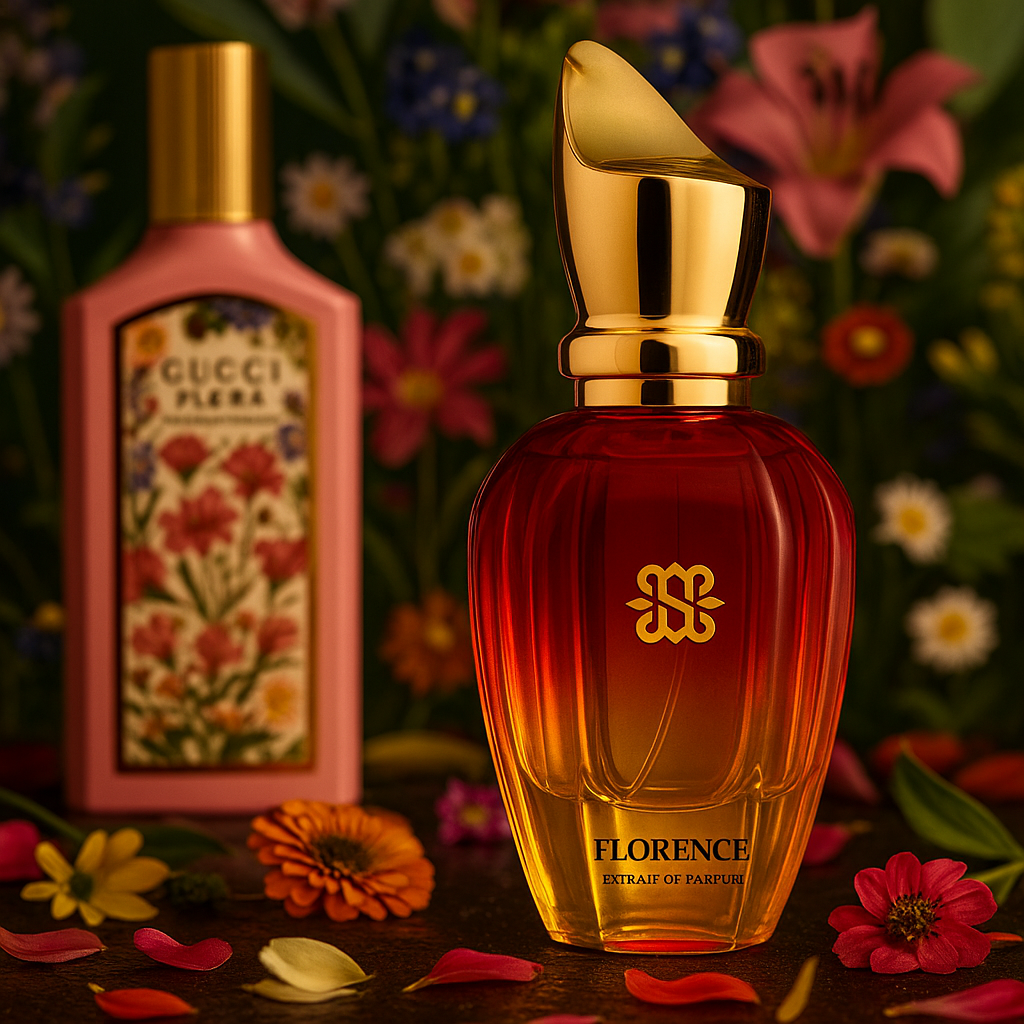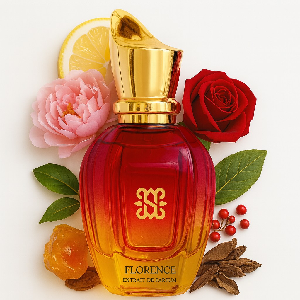 Florence is a floral, elegant fragrance that evokes the timeless beauty and charm of a blooming garden. The fragrance opens with a fresh burst of citrus and peony, creating an airy and light introduction that feels as delicate as a morning breeze. The heart is where the fragrance truly blooms, with rich and opulent notes of rose, osmanthus, and sandalwood coming together in perfect harmony, creating a soft, floral symphony with a creamy, woody undertone. The base is grounded in a warm, musky embrace, with patchouli and sandalwood adding depth and sensuality, leaving a lasting impression that is both graceful and unforgettable.